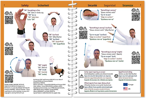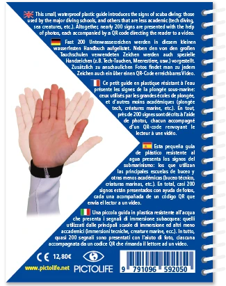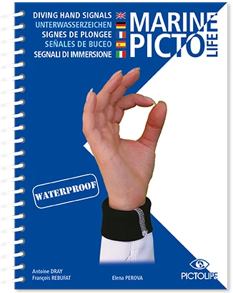 Ce petit guide en plastique résistant à l’eau présente les signes de la plongée sous marine : ceux utilisés par les grandes écoles de plongée, et d’autres moins académiques (plongée tech, créature marine, etc.).