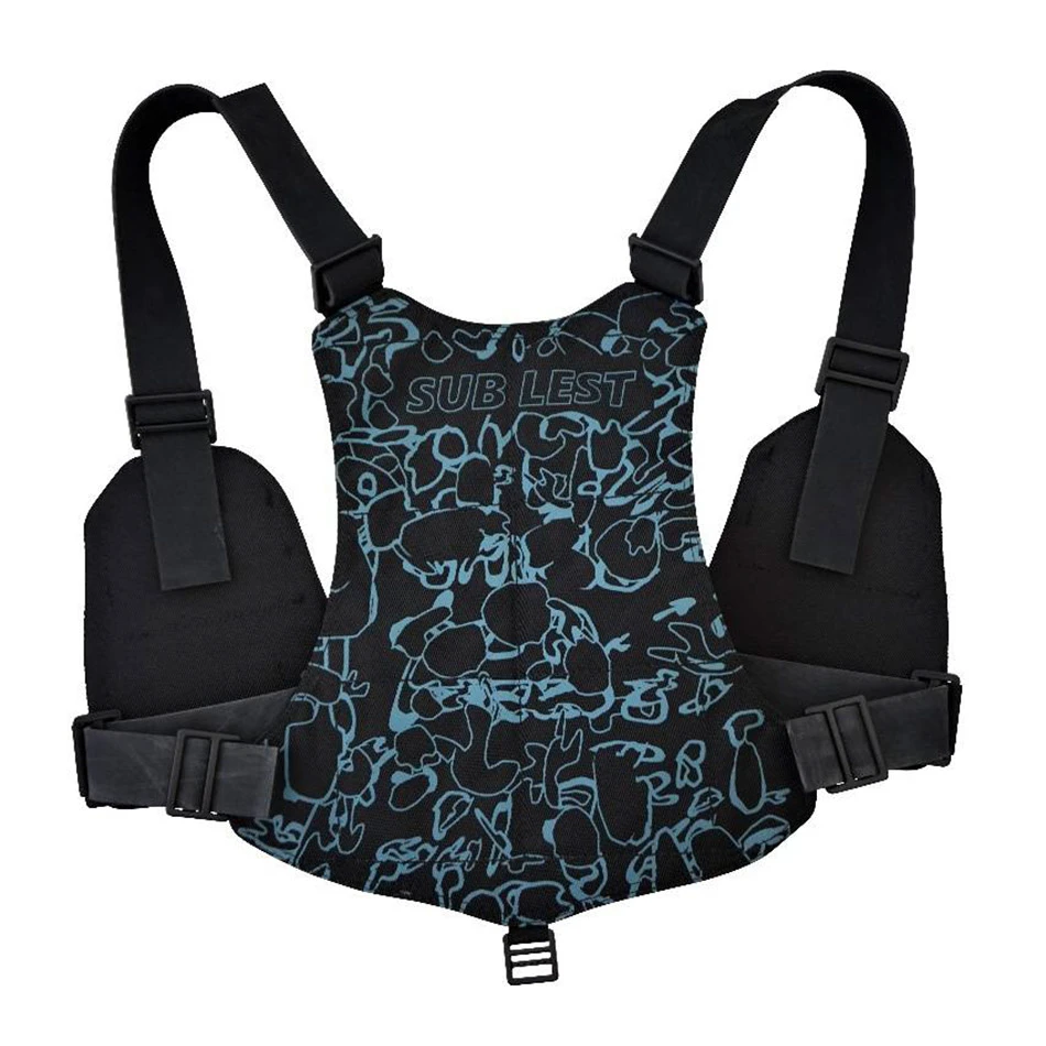 Gilet baudrier 3 pièces pourvu de 10 poches vides à lester. Convient pour une combinaison sèche ou pour la chasse sous-marine. Confectionné à partir de toile polyester, à flottabilité neutre. Une seule taille, réglable au niveau des bretelles et de la ceinture. Sangles caoutchouc 3 mm d’épaisseur, rugueuses sur les 2 faces pour ne pas glisser sur la combinaison. La boucle de ceinture est de type US en inox. La pièce dorsale peut recevoir une sous-cutale si besoin. Peut contenir jusqu’à 12 voire 14 kg si l’on élargit les 2 poches basses de la pièce arrière pour y loger des plombs de 2 kg plutôt que des 1 kg (il suffit de découdre deux lignes de coutures). Les poches acceptent tous les formats de lest du marché et se referment par de solides rabats à velcro. Ce gilet est conçu pour ne pas se déformer sous la charge.